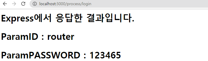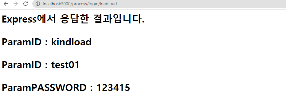 위 코드의 route에서 주소 부분을 /process/login/:name으로 바꿔주고 파라미터를 대신 받는 paramName을 추가 해주고 거기에 주소에서 받을 req.params.name을 넣어주었다.