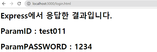 일단 이런 식으로 폼이 만들어지고 주소를 보면 localhost:3000/login.html로 바로 실행 시킨 것을 알 수 있다. 원래 서버 위치는 public 이지만 위의 코드에서 미리 지정을 해주어 /login.html 만으로 집입이 가능하다.