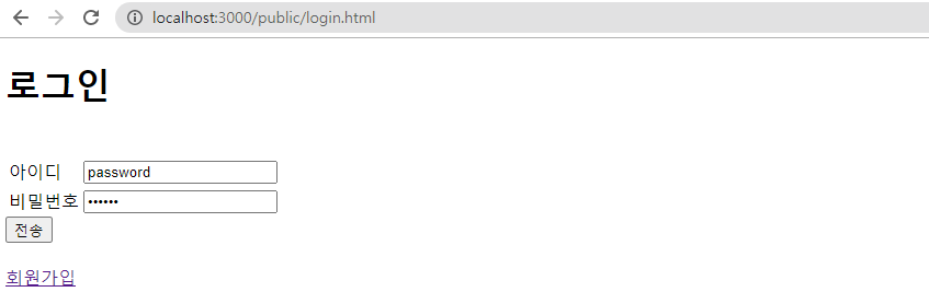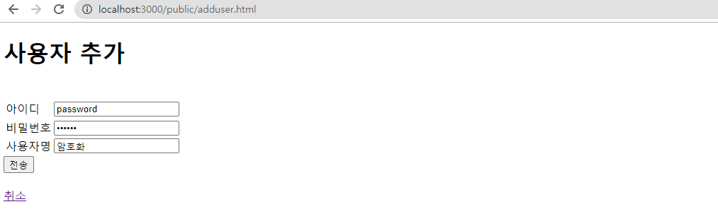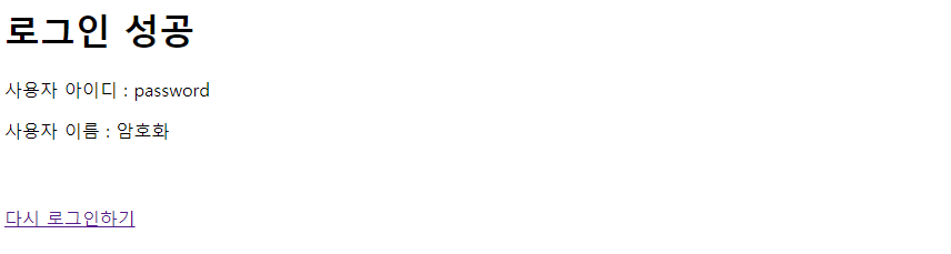아이디는 password, 비밀번호는 123456, 이름은 암호화 이렇게 3가지 정보를 보내보니
