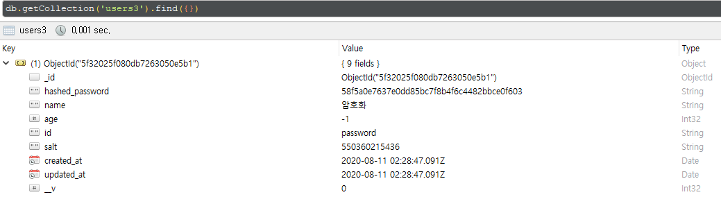 ROBO 3T를 통해서 확인을 해보니 아이디 이름은 우리가 아는 그 값으로 들어갔지만 hashed_password는 password에서 암호화 된 값으로 들어 간 것을 확인 할 수 있다.