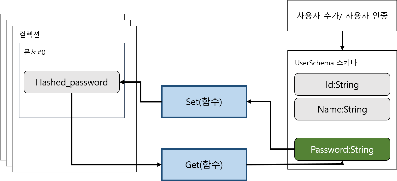 이건 createUserSchema로 초기에 스키마를 설정하는 것을 따로 함수로 만들었다. 여기서 설정하는 함수는 MongoDB 내부에 설정하는 함수이고 password라는 가상 속성를 만들기 위해서는 따로 만들어 줘야한다.