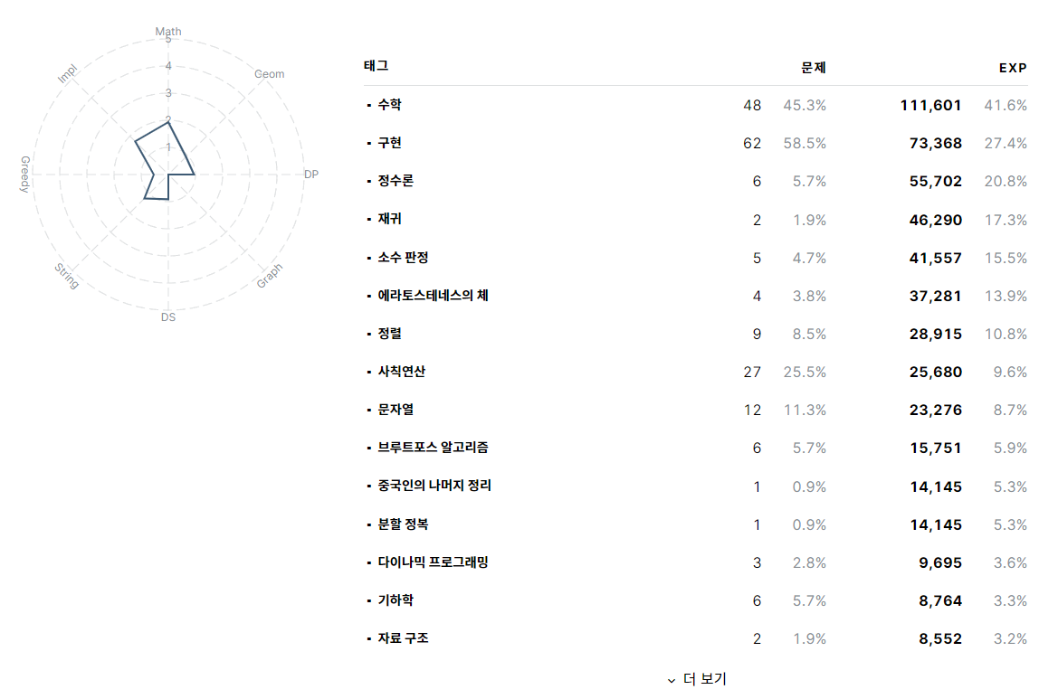 밑의 통계에서는 어떤 종류의 문제를 많이 풀었는지도 볼 수 있다 최근에 정렬을 여러개 풀었더니 정렬이 좀 올라오긴 했다만 사실 이 부분은 기준이 뭔지는 잘모르겠다...